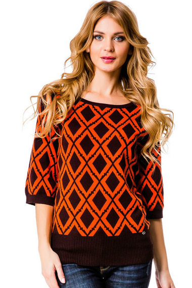 Стильный джемпер приталенного силуэта с широкими рукавами 3/4. Джемпер украшен контрастным оранжевым принтом, на манжетах и по низу изделия отделан широкой трикотажной резинкой в рубчик.