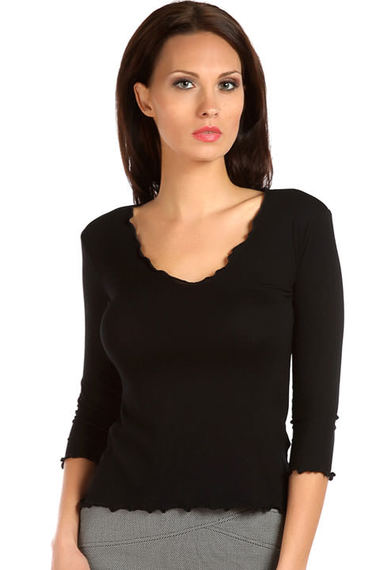 ОписаниеЭлегантная черная кофточка с рукавами длиной 3/4. Модель украшена оборками по рукавам, низу изделия и красивому глубокому вырезу.